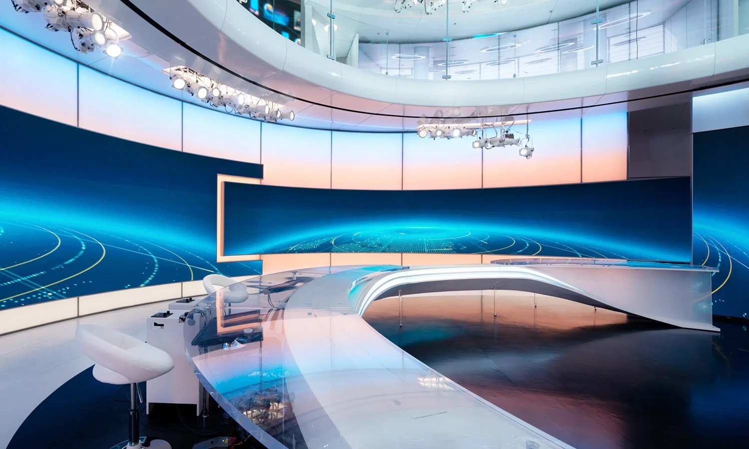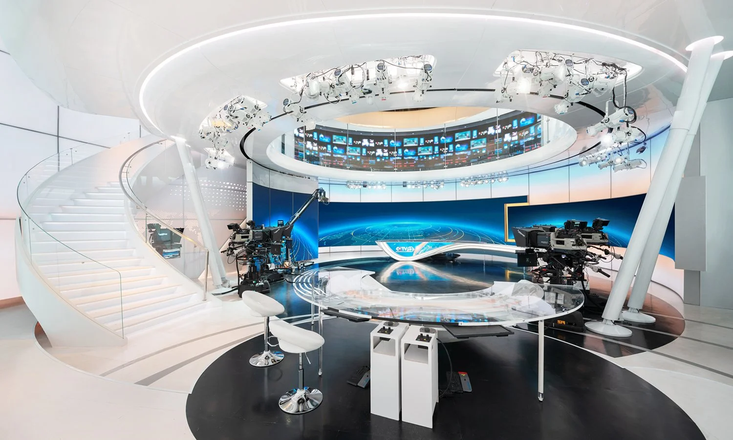 CCTV 13, mainland China’s largest news channel, has commissioned two cutting-edge broadcast studios within their Beijing headquarters. Together, these 7,000 square feet 650 square meters (650 square meters) of studio space share a sleek, minimal palette of high-gloss white and silver finishes, punctuated by sweeping forms and flexible LED elements that adapt to diverse programming needs.