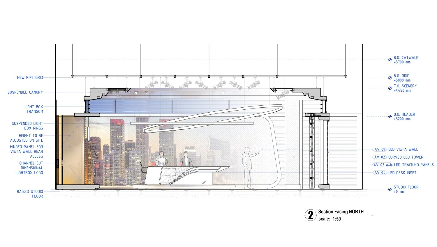 A new structural mezzanine capitalizes on the taller studio’s verticality, creating dynamic stand-up broadcast positions and emphasizing the impressive height. This innovative layering enhances visual storytelling and supports CCTV’s live hourly news reports and nightly current affairs programs.