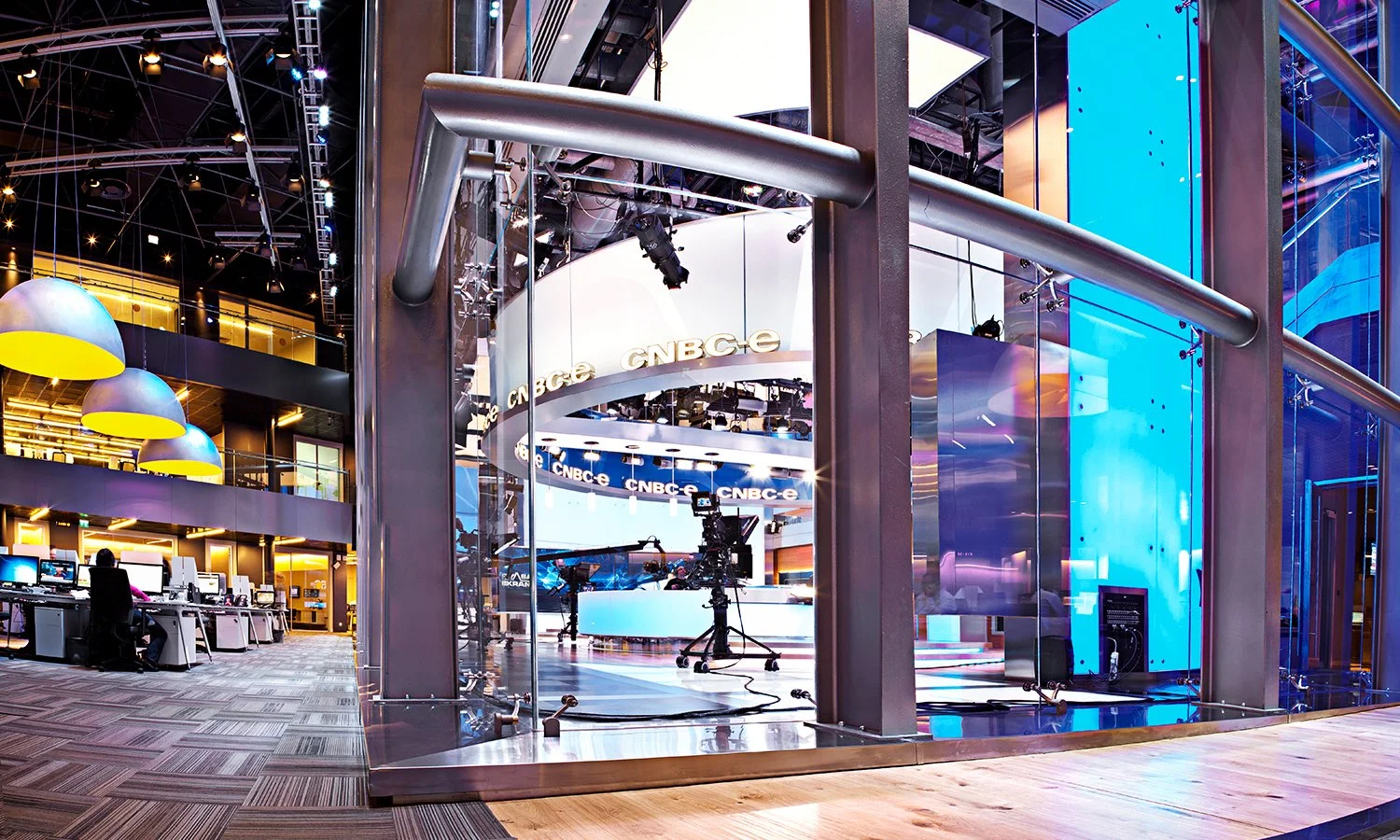 This project redefines the traditional broadcast studio with a transparent new environment for programming for NTV and CNBC-e. Departing from the usual “black box” secrecy of news production, the studios are encased within a glass envelope bisected by a public stairway, inviting the outside activities in to the studios.