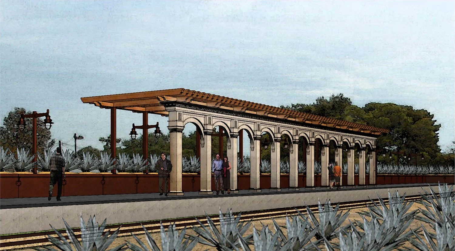 The design for the station platform incorporates local materials and neoclassical forms, and details inspired by the coa de jima, the specialized tool jimadores use to harvest agave. This thoughtful nod connects guests directly to the roots of tequila production.