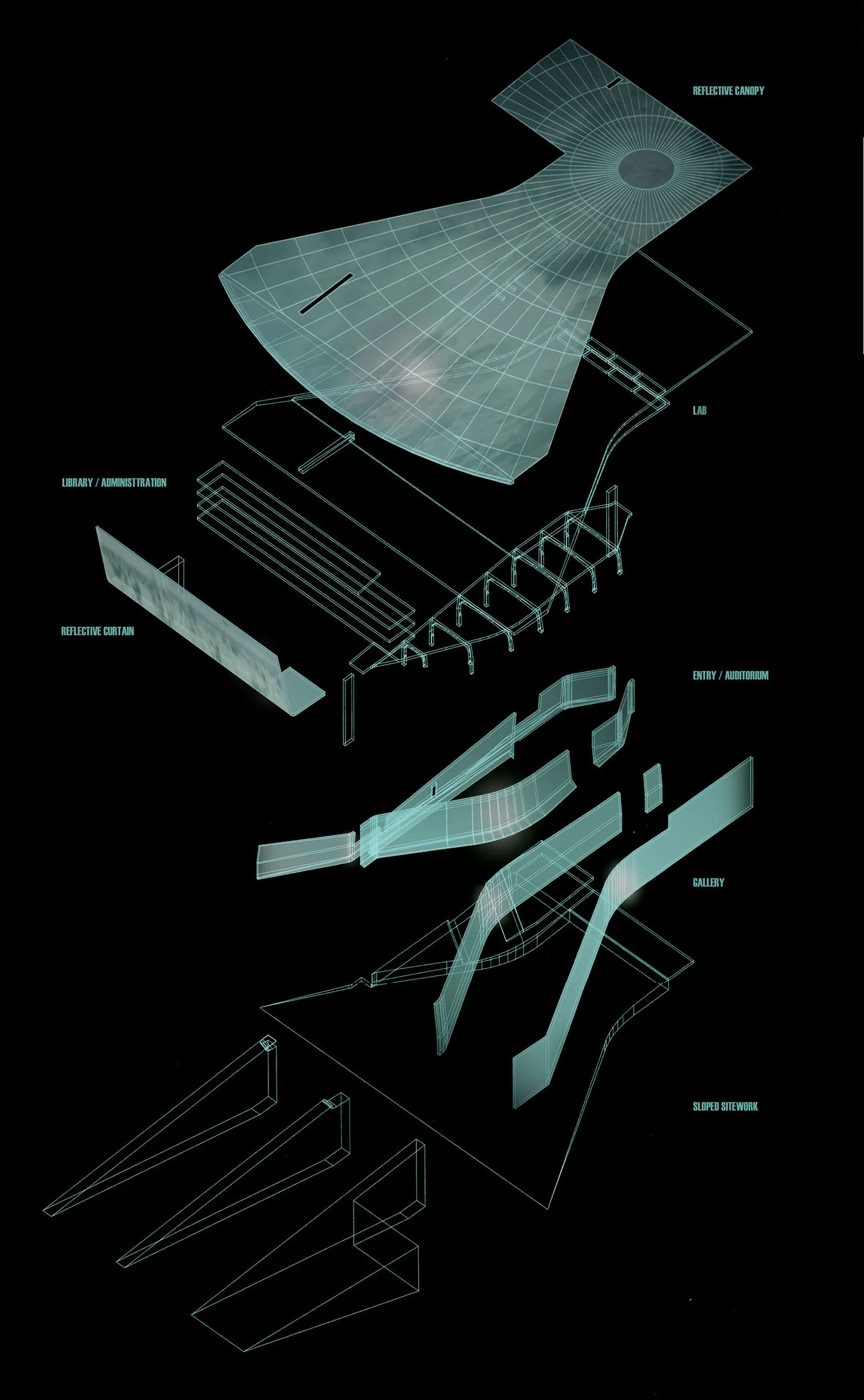 The institute’s program envisions visitor amenities, display galleries, classrooms, lecture halls, research labs, and administrative offices - all integrated within a responsive architectural framework that bridges scientific inquiry with the natural world.