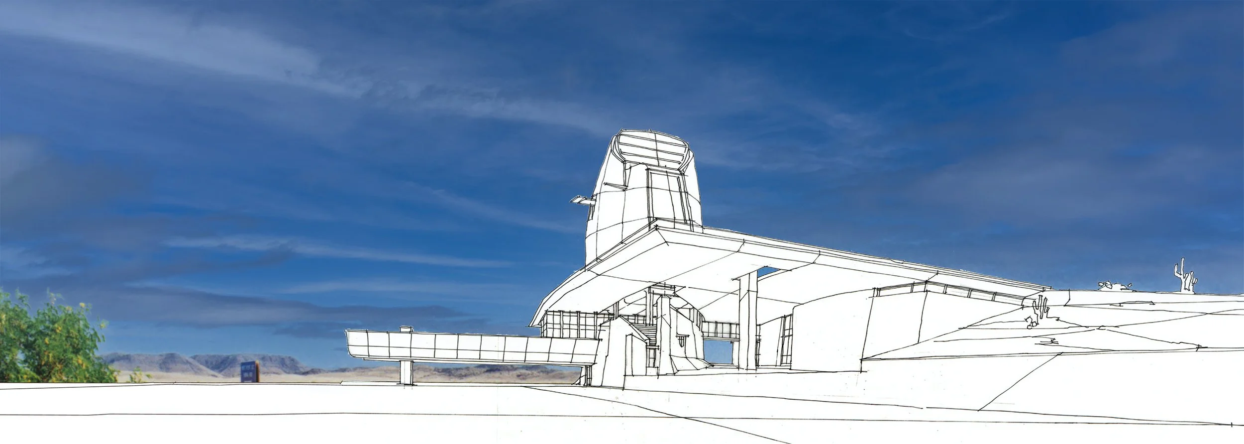 Beneath the canopy, sculpted buildings are oriented to create a south-facing venturi that channels airflow through the interstitial spaces. This design facilitates continuous study and measurement of wind patterns and air velocity in this unique desert environment.